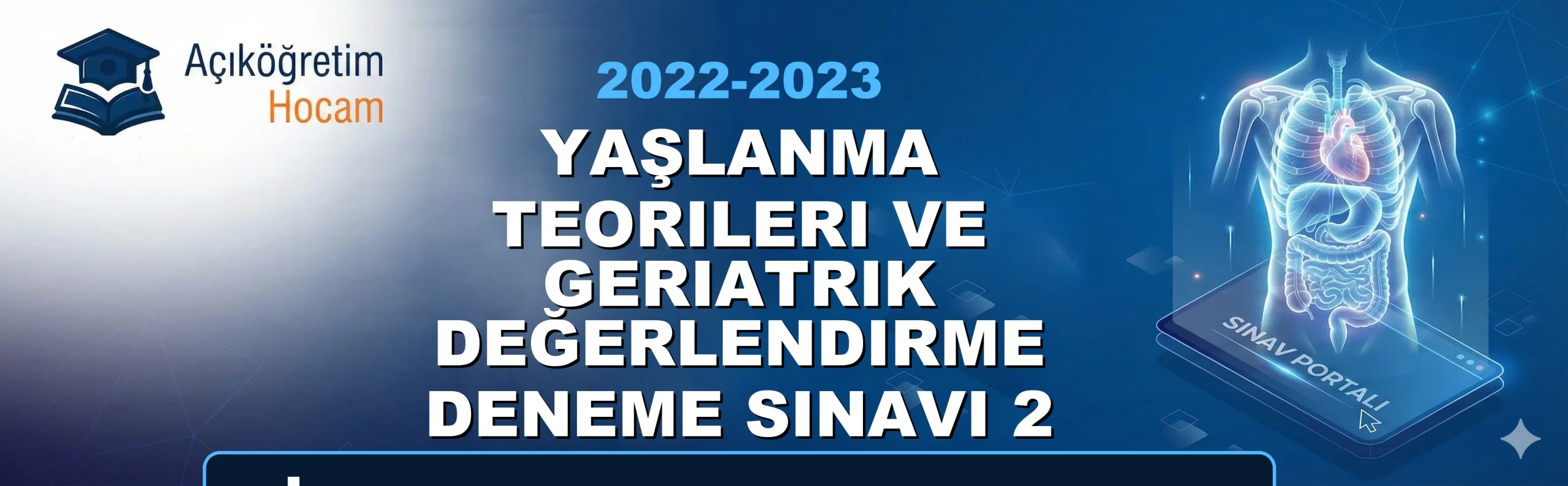 📌 Sınav Öncesi Kısa BilgiDeğerli AUZEF bölümü öğrencileri; bu sayfada Yaşlanma Teorileri ve Geriatrik Değerlendirme Deneme Sınavı 2 2022-2023 Final Çıkmış Soruları dersine ait geçmiş yıllarda çıkmış soruları ve pratik deneme testlerini sizin için bir araya getirdik. Sınavda zamanı iyi yönetmek ve soru tiplerine tam olarak aşina olmak için aşağıdaki özel test motorumuzu kullanabilirsiniz. İster "Çalışma Modu" ile anında cevapları görün, ister "Sınav Modu" ile kendinizi zamana karşı test edin. Şimdiden sınavlarınızda başarılar dileriz!